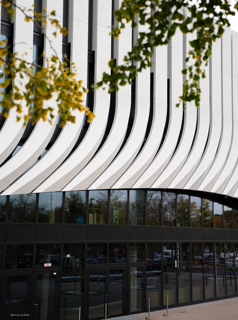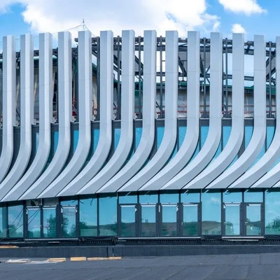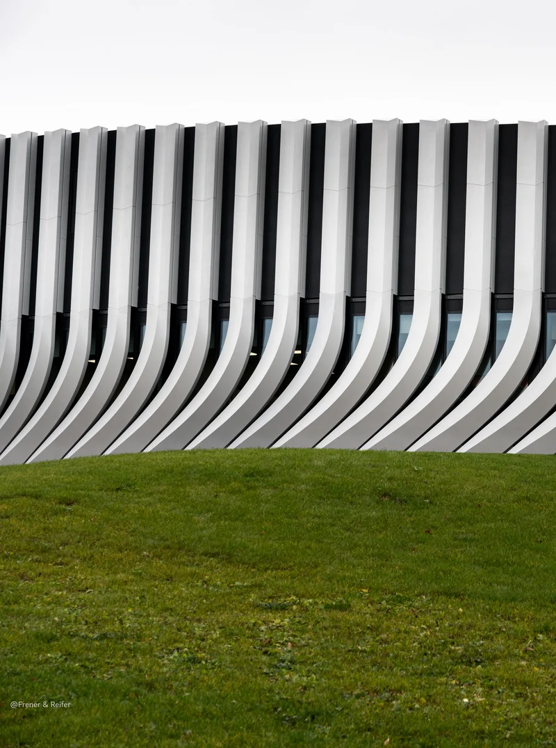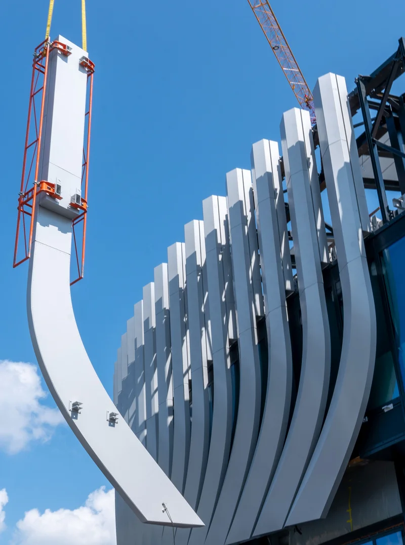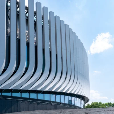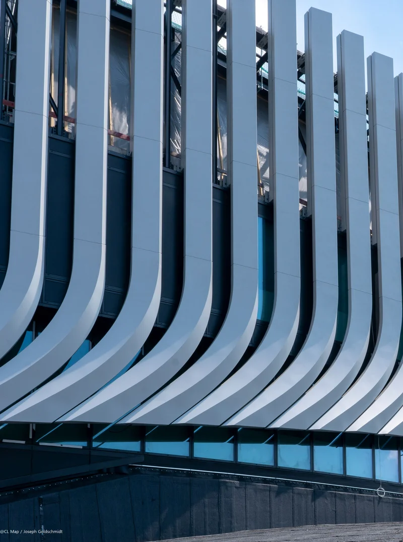 Vorgelagert verstärken die geschwungene Aluminium-Finnen optisch die Geometrie des Stadionbaus.