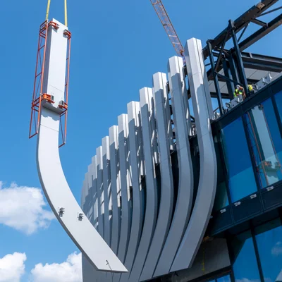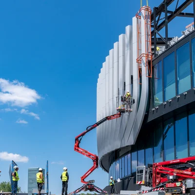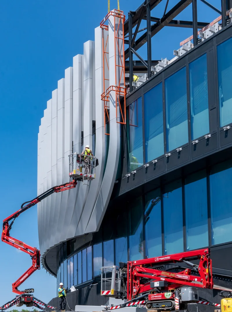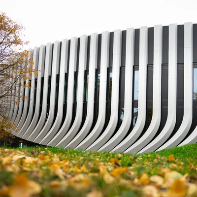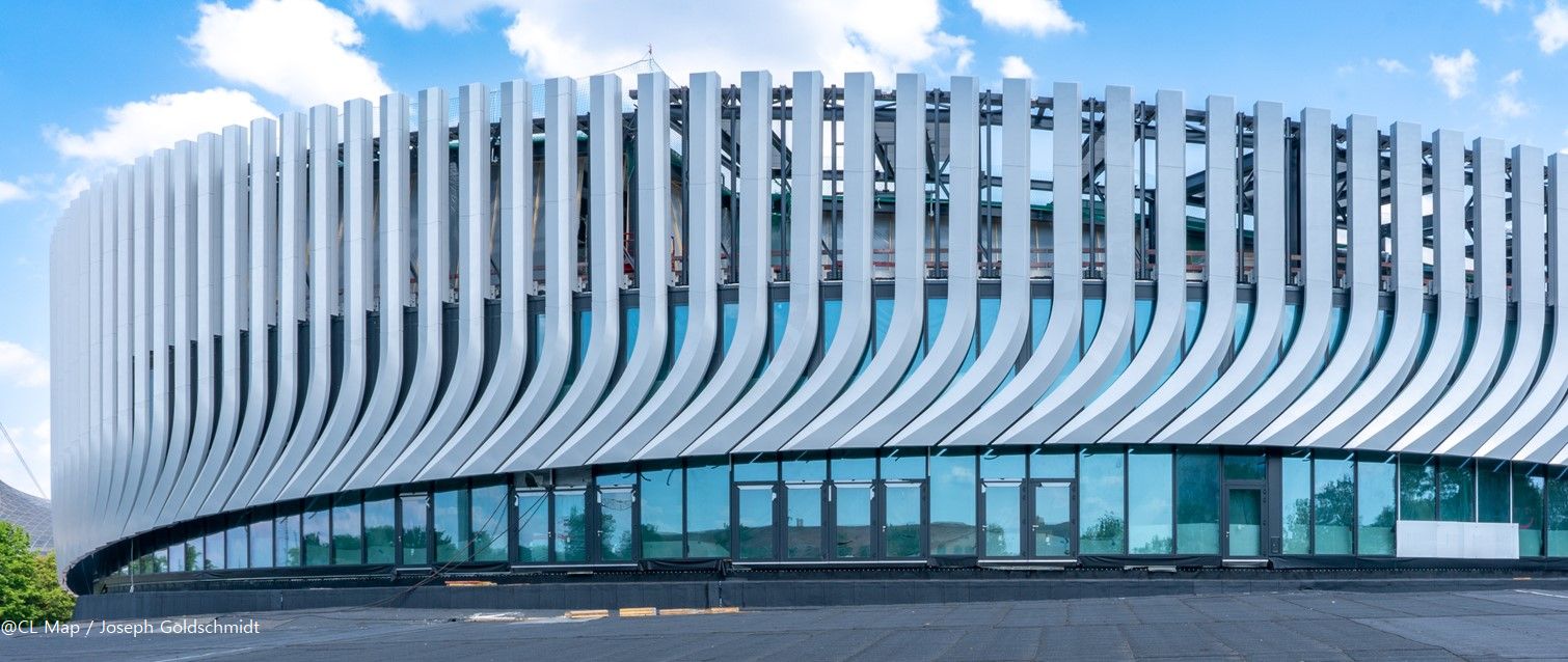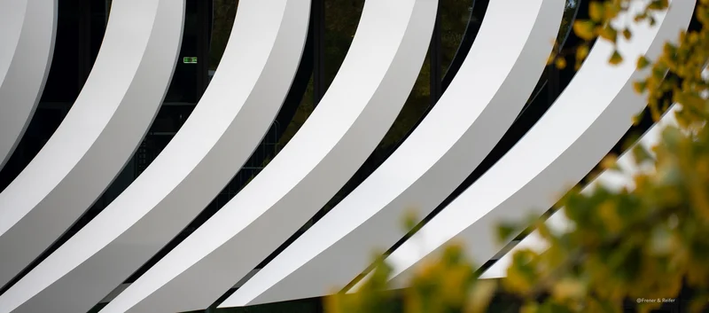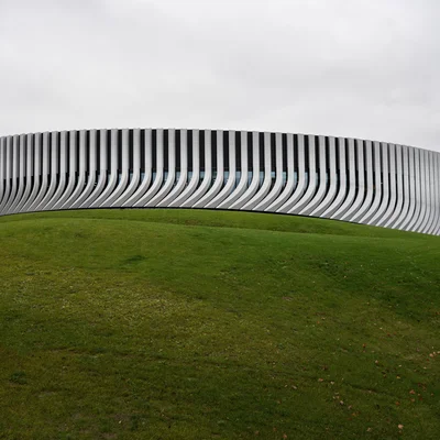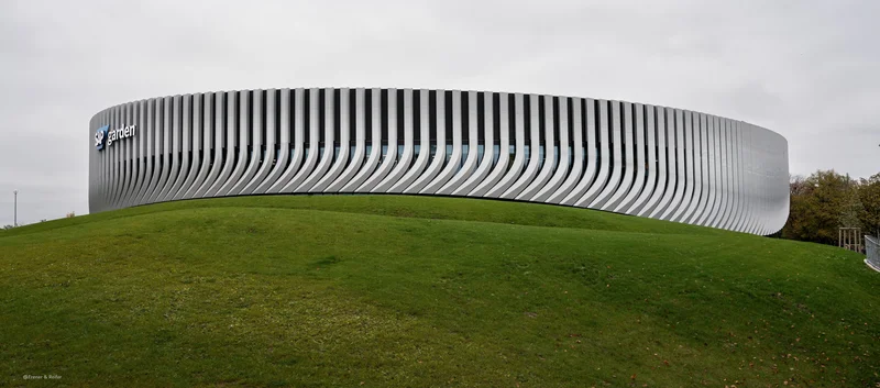 Vorgelagert verstärken die geschwungene Aluminium-Finnen optisch die Geometrie des Stadionbaus.