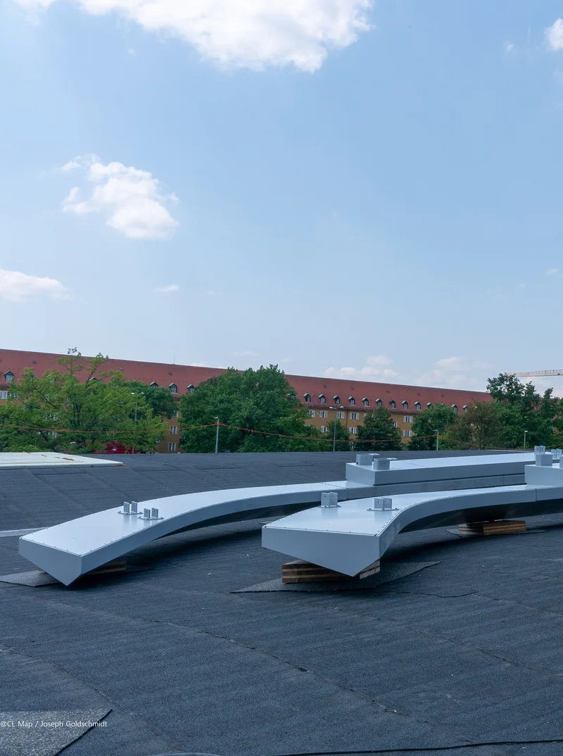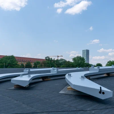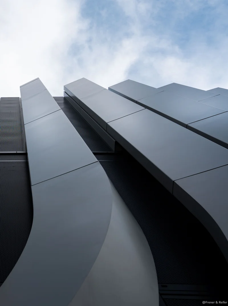 Verkleidung des Technik-Bereichs mittels geschichteter Aluminium-Blechverkleidungen.